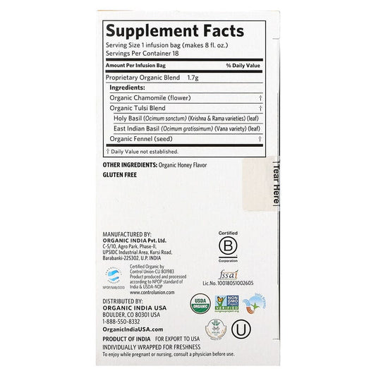 Tulsi Tea, Honey Chamomile, Caffeine-Free, 18 Infusion Bags, 1.08 oz (30.6 g)