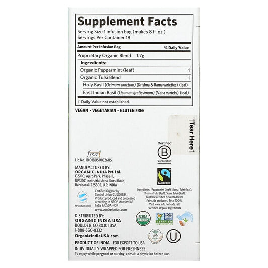 Tulsi Tea, Peppermint, Caffeine-Free, 18 Infusion Bags, 1.08 oz (30.6 g)