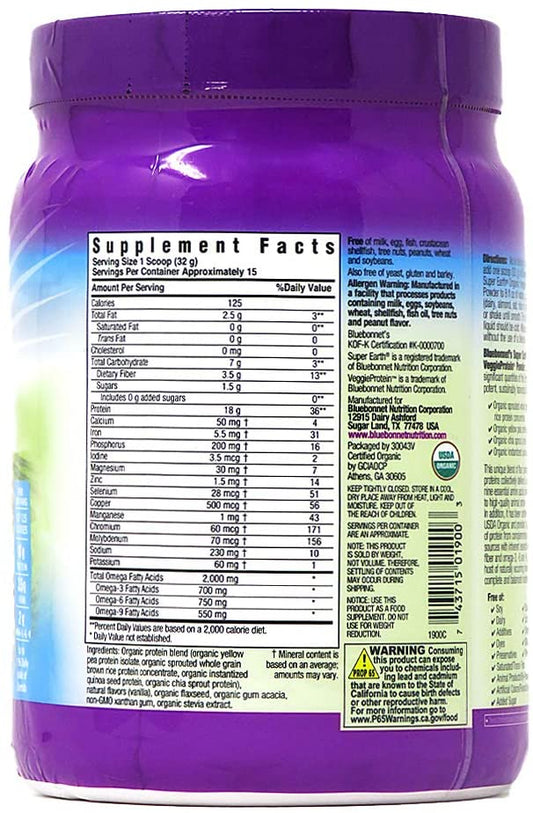 Super Earth Organic Veggie Protein Powder, Vegan, USDA Organic, Vanilla Flavor, 1 lb, 15 Serving