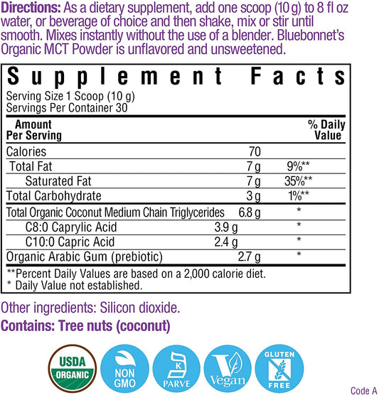 Organic MCT Powder, USDA Organic, Vegan, 10.58 oz, 30 Servings, Unflavored, Unsweetened