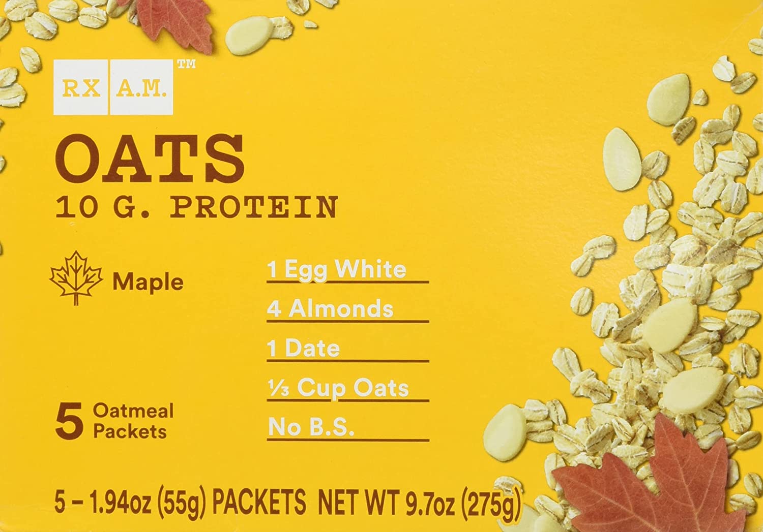 Rx a.M. Oats. With 12 grams of protein, 6g Fiber, and simple ingredients like egg whites, fruit, nuts and gluten free oats.